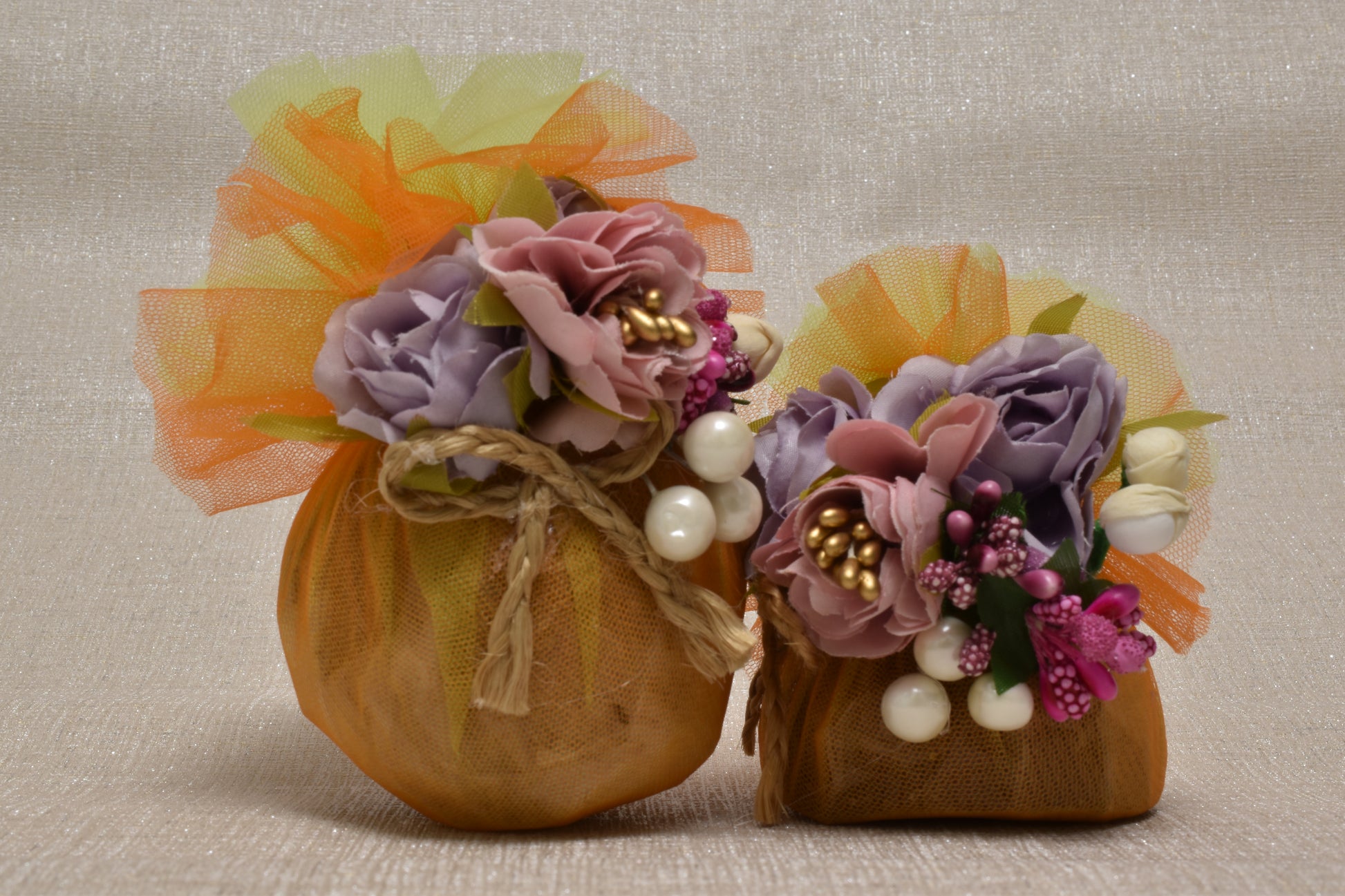 Pouches wrapped in a brown/tan tulle, featuring large, dramatic ruffles of orange and yellow tulle on top. They are adorned with a lush bouquet of dusty rose and lavender flowers, tied with rustic jute twine and accented with white pearls, resulting in a soft, textured Gut Nariyal.